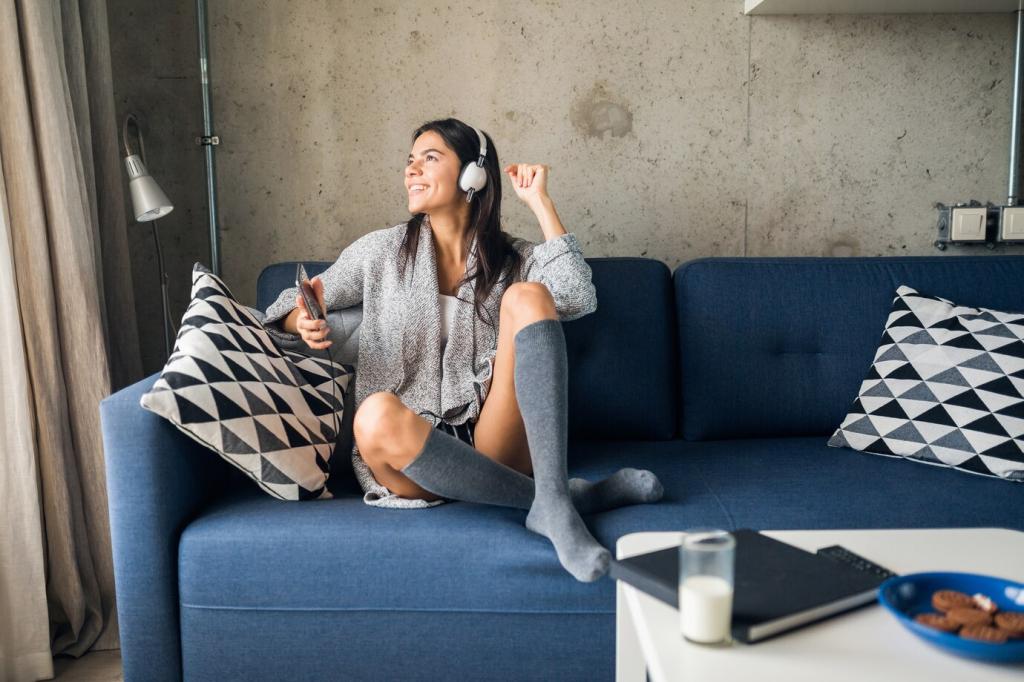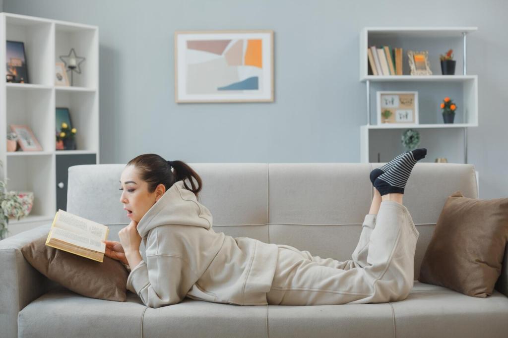 Kombiniere Umgebungslicht, eine fokussierte Leselampe und sanfte Akzentlichter. Warmweiß zwischen 2700 und 3000 Kelvin entspannt, während gezielte Lichtkegel Spiegelungen vermeiden. Teste Winkel und Höhen, bis Schatten verschwinden. Teile in den Kommentaren, welche Lichtschichten deine Leseecke am besten zum Leuchten bringen.